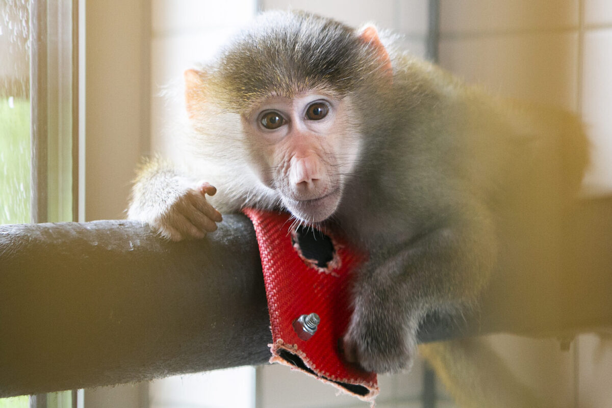 El aprendizaje en estas edades es importante por lo que, ya estando en cuarentena, nuestros especialistas en comportamiento animal comenzaron la socialización con una madre de acogida: Simone. Mediante este vínculo, Olive comenzó a aprender cómo comportarse como un babuino. Tiempo más tarde, también conoció a su hermano de acogida, Omar.