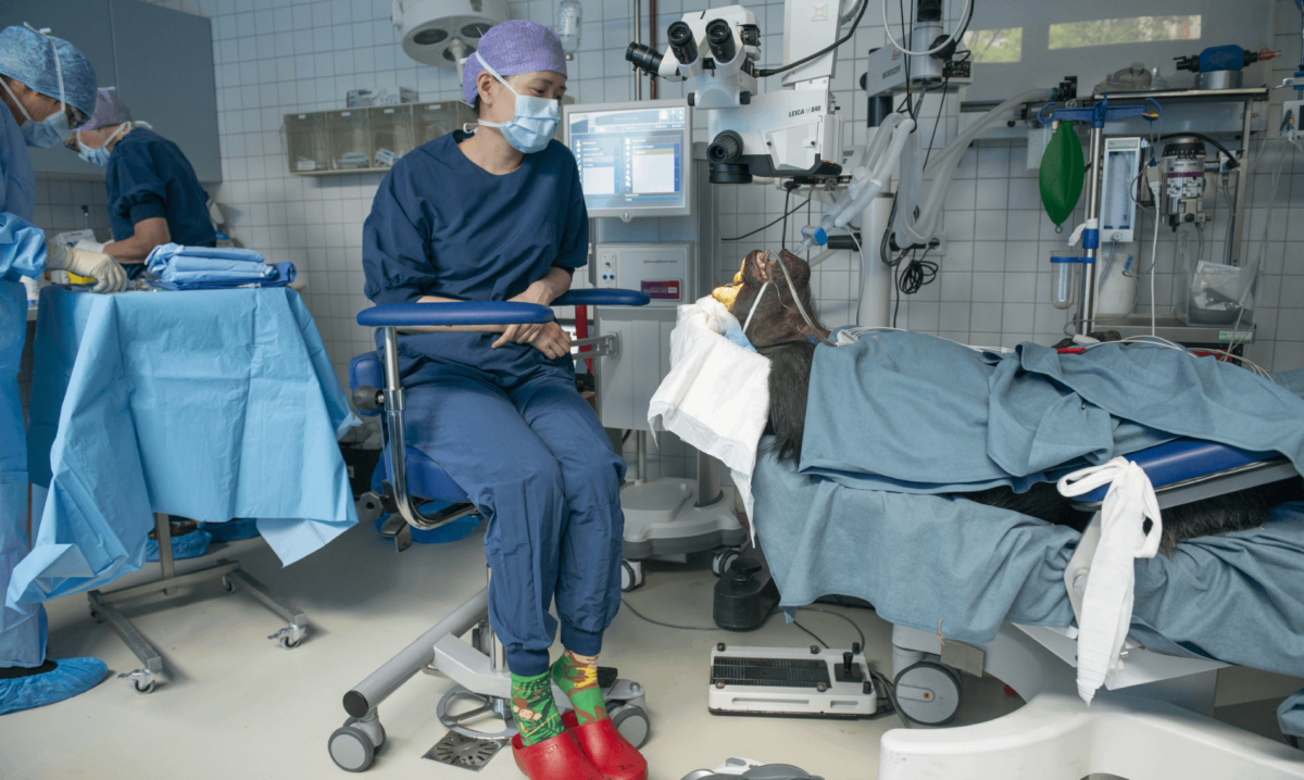 Hester van Bolhuis, nuestra veterinaria en AAP Países Bajos donde se encuentra Fiffy, decidió que la situación no podía continuar y pidió ayuda a los oftalmólogos de la Universidad de Leiden. Fiffy, que se estima que tiene entre 30 y 40 años, es hasta donde se sabe el primer chimpancé que se somete a una operación de este tipo en los Países Bajos.
