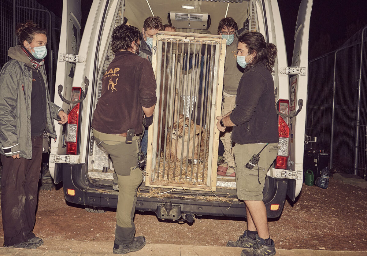 Finalmente ayer, los cuatro leones y un licaón llegaron AAP Primadomus, el centro de rescate en España de la ONG internacional AAP – Animal Advocacy and Protection.