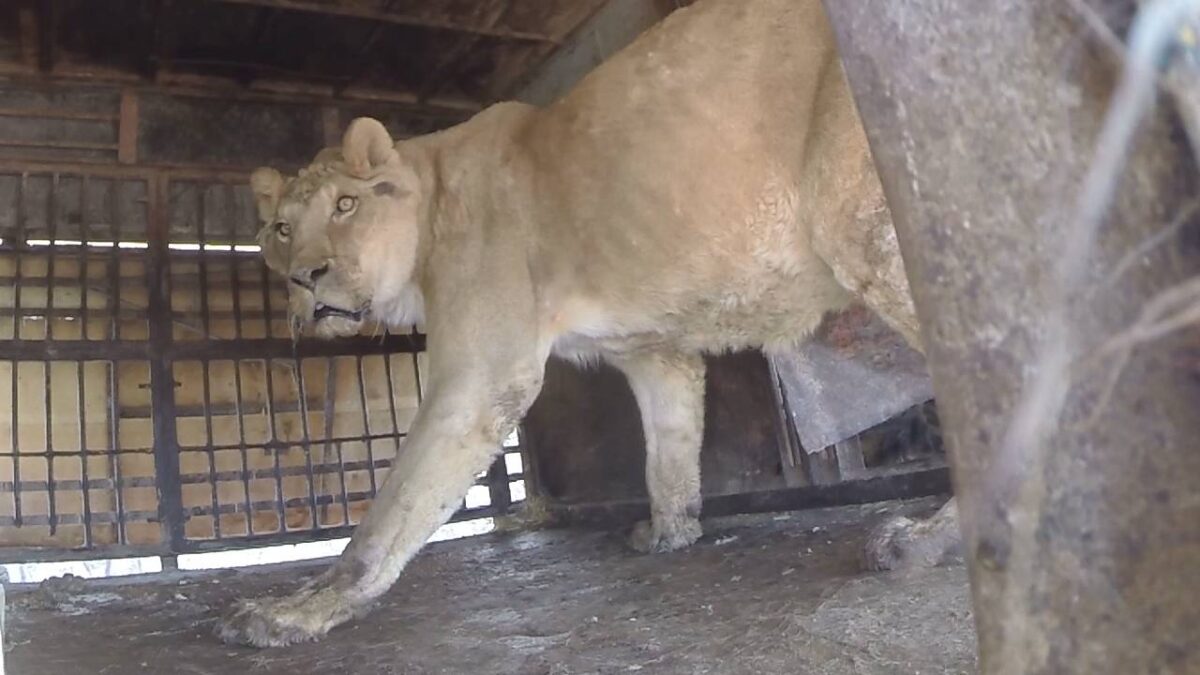 Como el león Govani, que vivía en una pequeña jaula móvil sucia y estaba en muy mal estado. La AAP trabaja para acabar con el uso de animales salvajes en el entretenimiento.