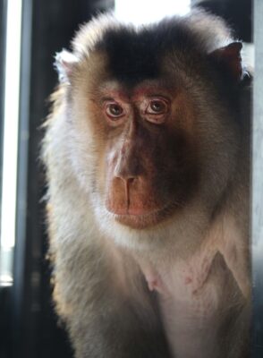 Paralelamente en Holanda, Pegase (24 años, 1994), un macho de macaco de cola de Cerdo rescatado en 1999 tras la quiebra del zoo donde estaba, quedaba solo en Almere. Era urgente darle nuevos compañeros. Así, en diciembre, Pegase llegaba a Primadomus y poco después comenzamos las presentaciones con las que esperábamos fuera su nueva familia.