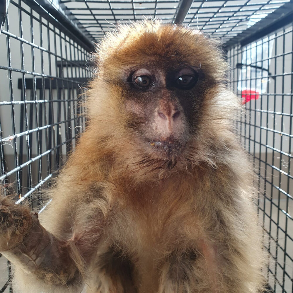 Tras la primera revisión veterinaria en el lugar de rescate, concluímos que los dos macacos de Berbería se encontraban en muy mal estado de salud. Han sido trasladados a nuestro centro de rescate de AAP en España, donde pasarán primero una cuarentenay cuidaremos de que mejoren lo más pronto posible.