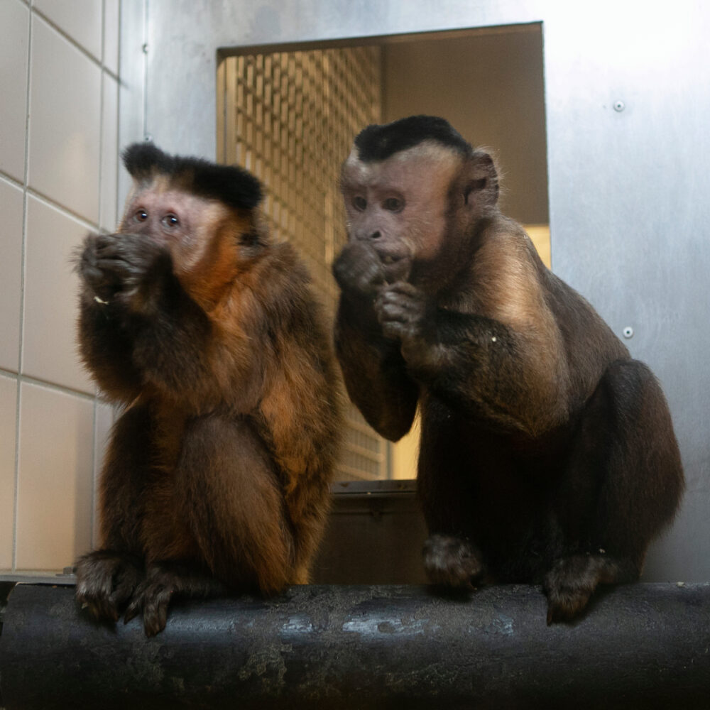Durante el periodo de cuarentena, presentamos a los dos monos capuchinos. Resultaron ser la pareja perfecta: Pitaya comenzó a mostrar un comportamiento menos estereotipado, gracias a la compañía de Canvet. Y a Canvet también se le podía ver que estaba mucho más tranquilo y relajado.