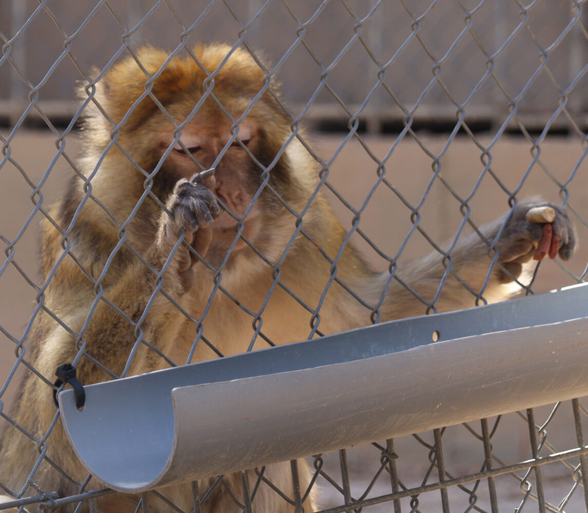 La macaca de Berbería Sarita, fue rescatada en 2014 de un particular en Málaga. Al principio estaba suelta por la casa, pero finalmente su dueño la encerró en una jaula cuando el comportamiento de Sarita fue volviéndose más agresivo y temperamental. Sarita, llegó a escapar de esta instalación, y estuvo vagando por el vecindario hasta ser capturada. Así permaneció encerrada, sola, durante 6 años.