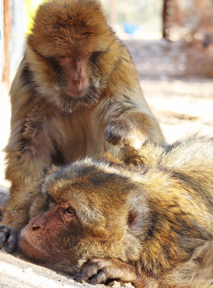 Al principio de su afección, se mostraba muy insegura con la presencia de otros macacos de Berbería. Primero con Josefa, y después con Morito, sus dos compañeros le han ayudado a sobrellevar este problema. Especialmente Morito, quien ha sabido cómo respetarla y ayudarla desde el principio. Tanto es así que vemos muy a menudo momentos de acicalamiento entre ellos.