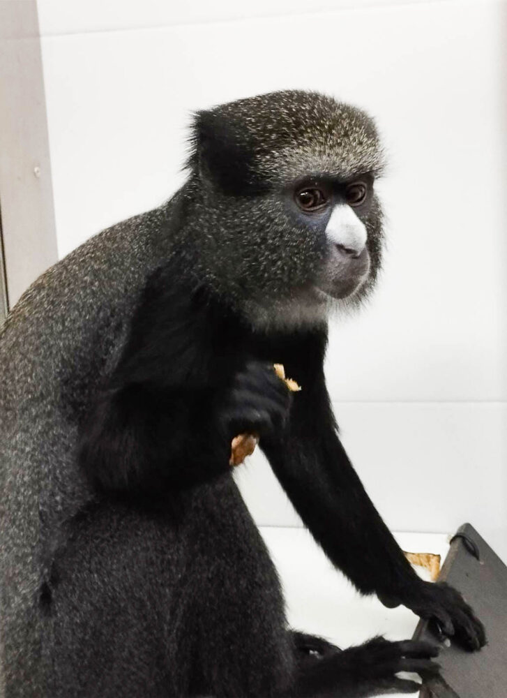 La mona, a la que hemos llamado Emare, tiene un ligero sobrepeso y una calva en su cola, aún por determinar si es resultado de estrés circunstancial o un comportamiento estereotipado más asentado que tengamos que tratar. Es tranquila, curiosa y activa. Dado que es un animal bastante raro y del que no contamos otros de la misma especie en AAP, en cuanto Emare termine su cuarentena buscaremos una institución especializara que cuente con otros Cercopitecos de Nariz Blanca con los que pueda ser socializada para asegurar su bienestar.